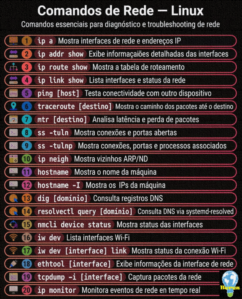 Este post reúne explicações objetivas de comandos essenciais para diagnóstico e administração de redes em sistemas Linux, acompanhadas de exemplos reais usados por Herez em ambientes de produção e laboratório. O objetivo é fornecer um material direto ao ponto, útil para administradores, desenvolvedores e estudantes.