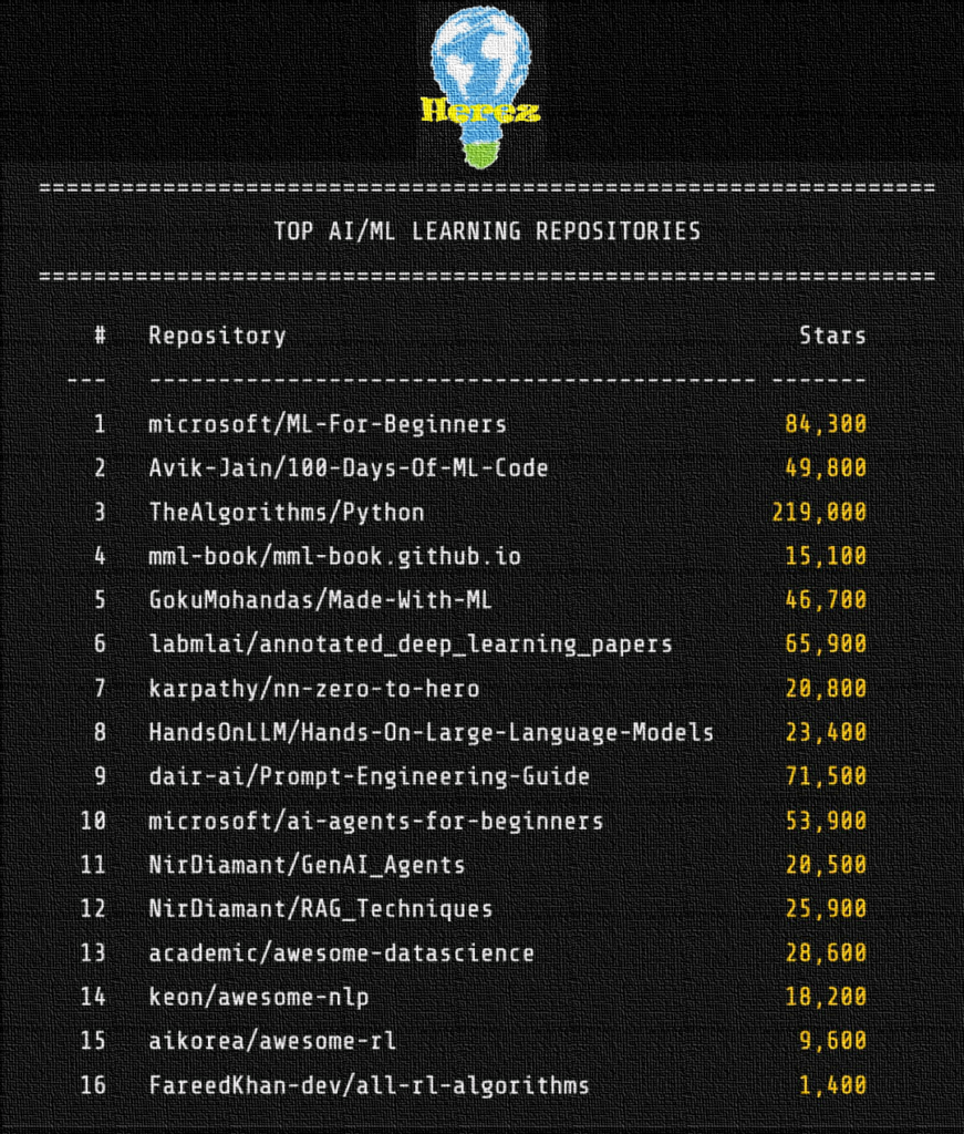 Este post reúne descrições práticas de repositórios que eu, Herez, utilizei para estudar inteligência artificial e aprendizado de máquina. Para cada repositório há uma explicação objetiva e um exemplo real de como o utilizei para aprender, experimentar ou aplicar conceitos.